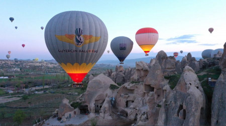 Tatil için ülkenin farklı kentlerinden Nevşehir'e gelen yerli konuklar, Göreme beldesinde sabahın ilk ışıklarıyla peş peşe gökyüzüne yükselen balonlara binerek, doğal ve tarihi güzellikleri kuşbakışı izledi.
