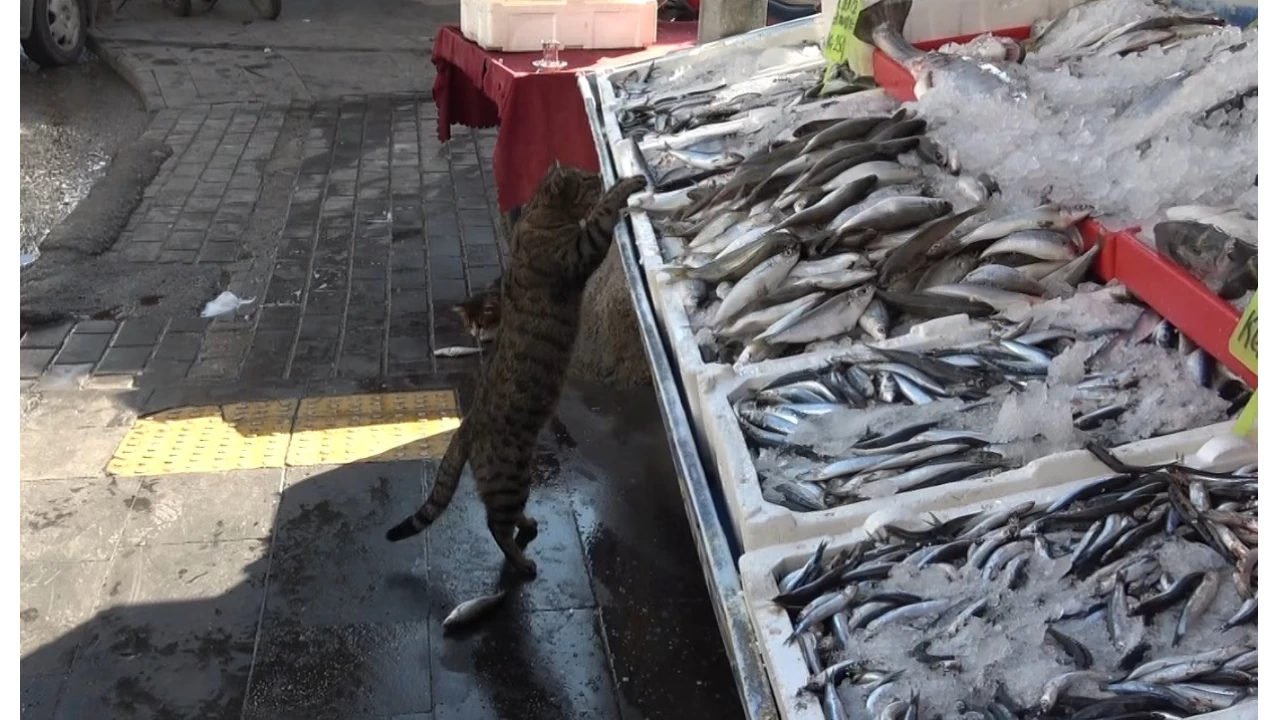 Karadeniz'deki bereket nedeniyle Kilis'te hamsinin kilosu 100 liraya düştü. Vatandaşların balığa ilgisi yoğun olurken, kediler de tezgahtan nasibini aldı