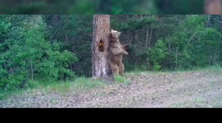 Doğa Koruma Milli Parklar (DKMP) Genel Müdürlüğü, Sarıkamış ilçesi Sarıçam ormanlarında ayının kaşınma dansının görüntülerini paylaştı