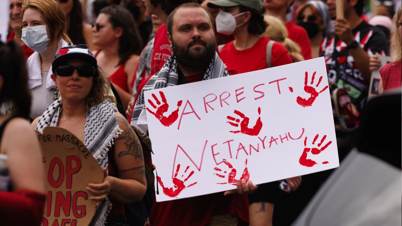 Netanyahu'nun hitabı sırasında Kongre dışında binlerce kişi İsrail karşıtı gösteri gerçekleştirirken, polis göstericilere göz yaşartıcı gaz ile müdahale etti. Sık sık "Filistin'e özgürlük" sloganı atan göstericiler, "Aranan savaş suçlusu", "İsrail'i silahlandırmayı durdurun" ve "Gazze'deki savaş suçlarını durdurun" yazılı pankartlar açarak, yere Filistin bayraklarına sarılı yaklaşık 30 adet insan boyunda karton tabut yerleştirdi.