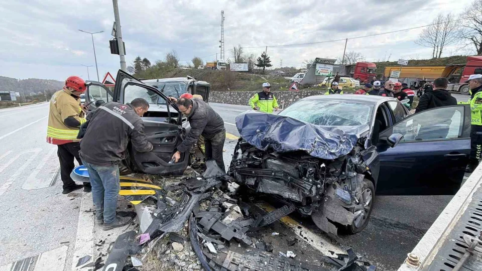 Düzce'de kavşakta meydana gelen kazada otomobil ile hafif ticari araç çarpıştı. Araçlarda sıkışan yaralı sürücüler itfaiyenin çalışmasıyla kurtarılırken, ulaşım bir süre tek şeritten sağlandı