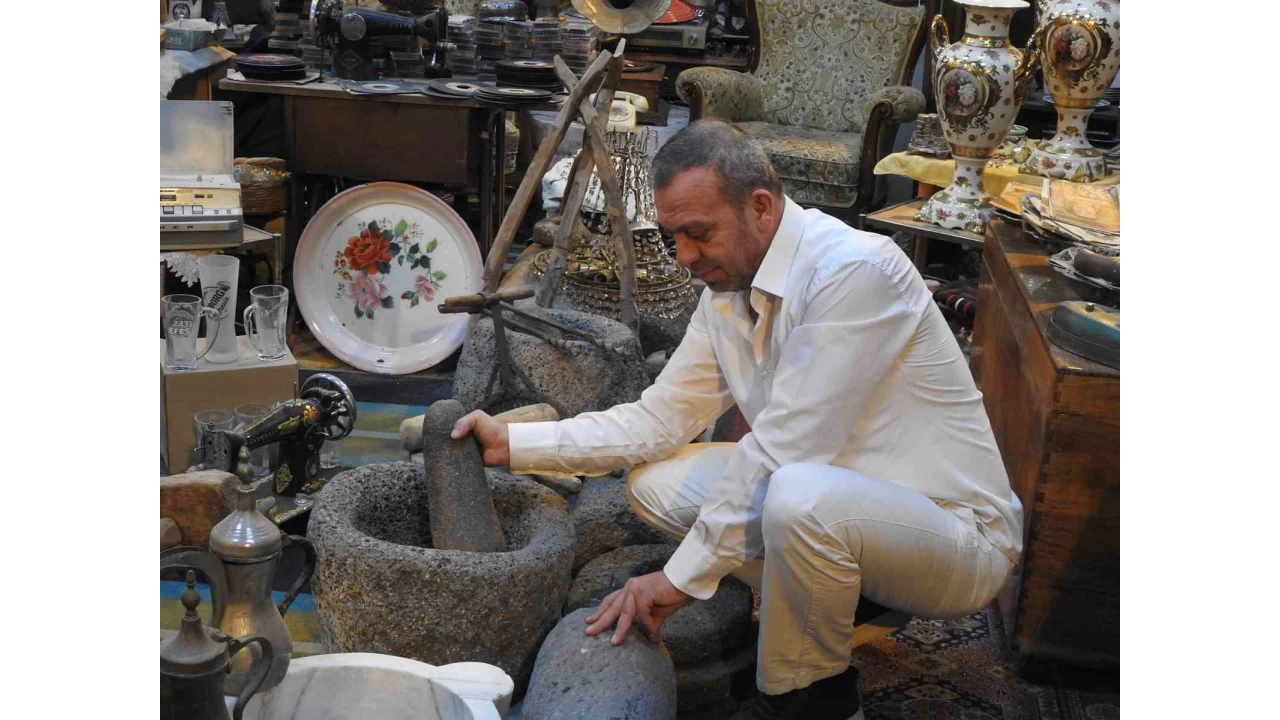 Kilis'teki bir antikacı dükkanında sergilenen yöresel ürünlerin üretiminde kullanılan eşyalar, ziyaretçileri geçmişe götürüyor. Antikacıyı gezen vatandaşlar, o dönemlerde üretimin ne kadar zor şartlarda yapıldığını ifade ediyor. Yaklaşık 20 yıldır antikacılık yaptığını belirten Murat Üzümbalı, Türkiye'nin farklı illerinden gelen ziyaretçilerin yöresel ürünlerin yapımında kullanılan taşları büyük bir ilgiyle incelediğini söyledi.