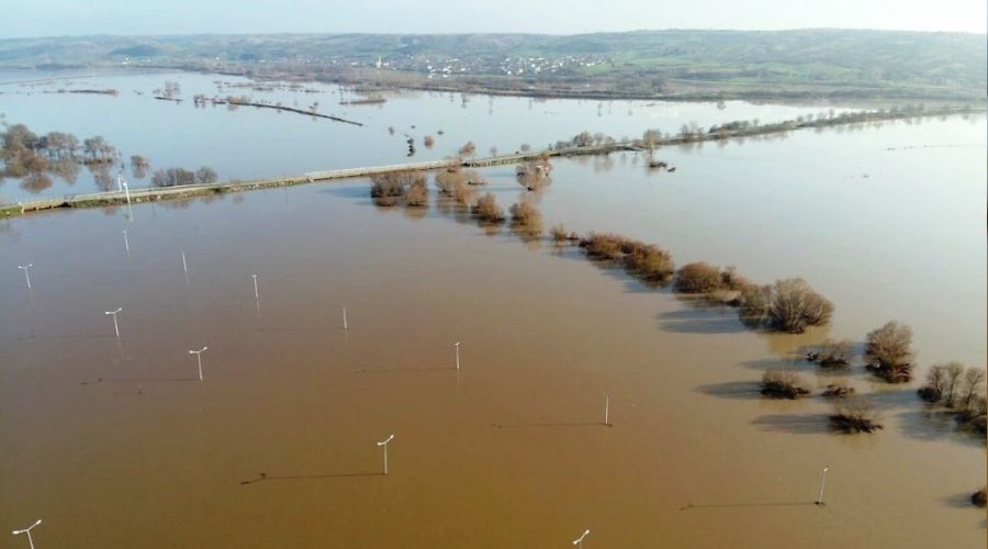 Kırklareli'nde Pazartesi gününden itibaren etkisini arttıran yağış, Ergene Nehir'nin debisinin yükselmesi sonucu tarım arazileri sular altında kaldığı anlar havadan görüntülendi