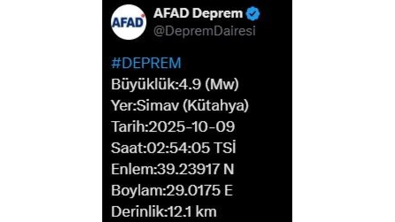 AFAD'ın paylaştığı bilgilere göre, Kütahya'nın Simav ilçesinde saat 02.54'te 4.9 büyüklüğünde deprem meydana geldi.