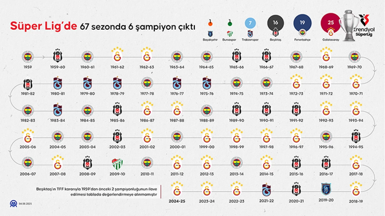 Lig tarihinde Galatasaray 25, Fenerbahçe 19, Beşiktaş 14, Trabzonspor 7, Bursaspor ve Medipol Başakşehir de birer kez şampiyon oldu. TFF Tahkim Kurulu kararıyla 1959'dan önceki 2 şampiyonluğunun da ilave edilmesiyle Beşiktaş'ın toplam şampiyonluk sayısı 16'ya ulaştı.
