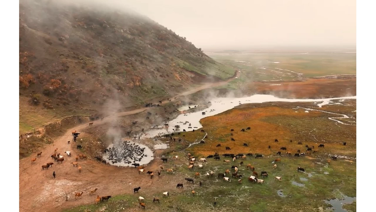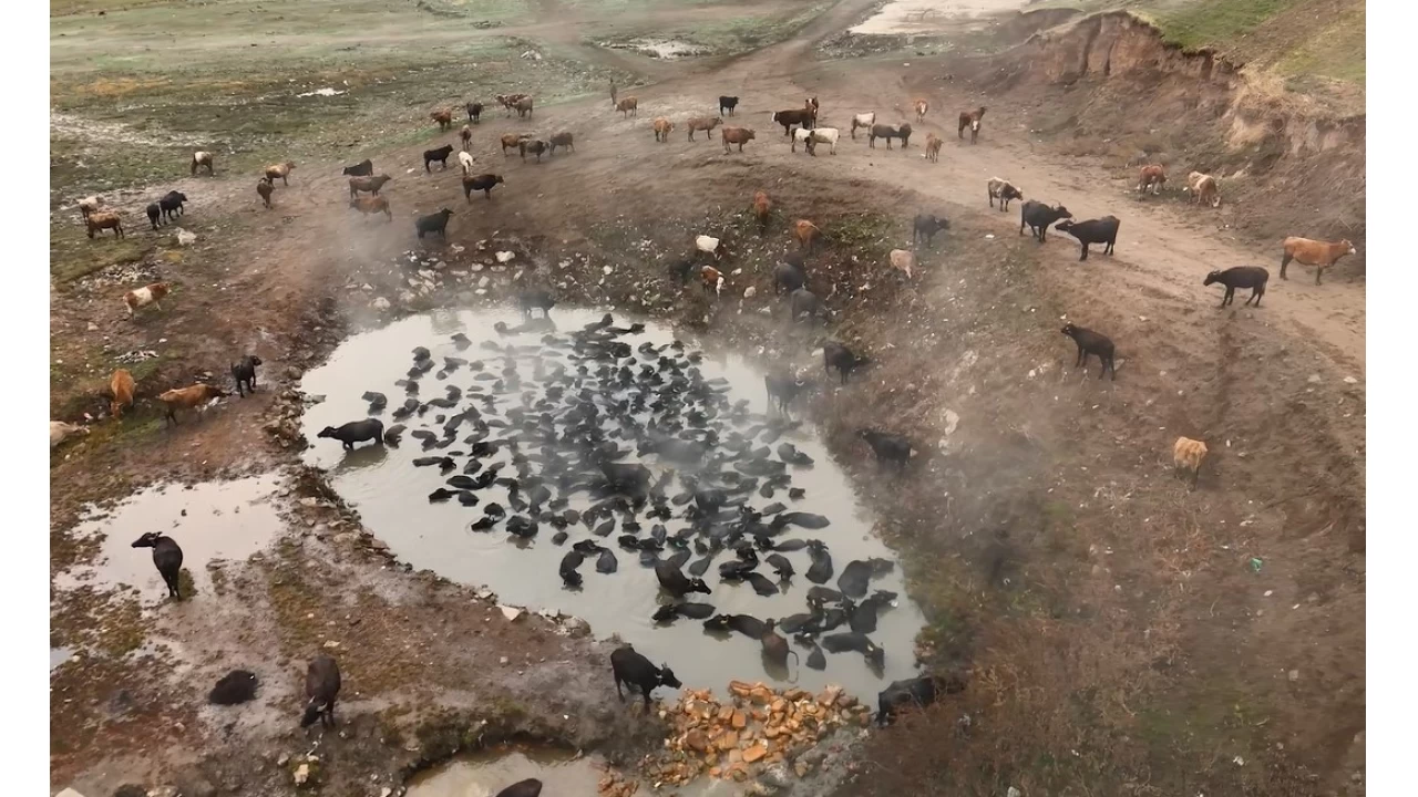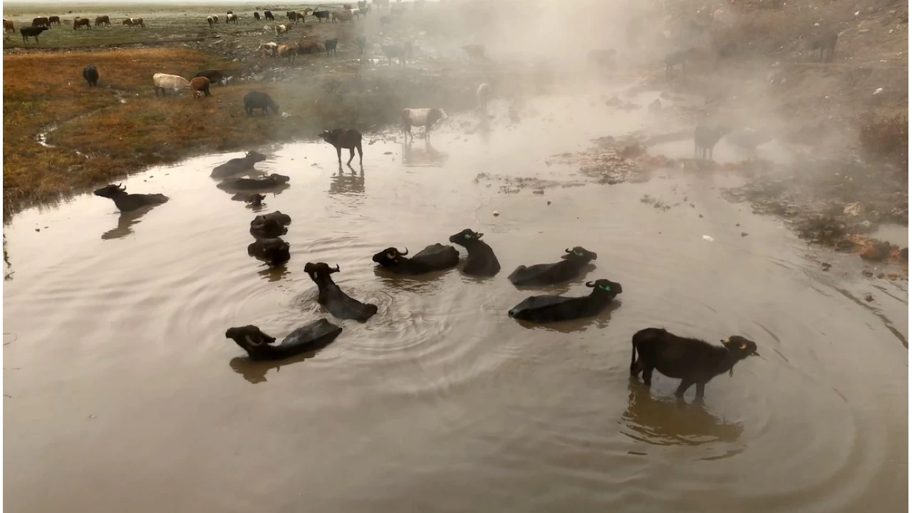 Dronla kaydedilen görüntülerde, kaplıcada yoğun şekilde bulunan mandalar ve çevredeki diğer büyükbaş hayvanlar adeta Afrika savanlarını andıran bir manzara oluşturdu.