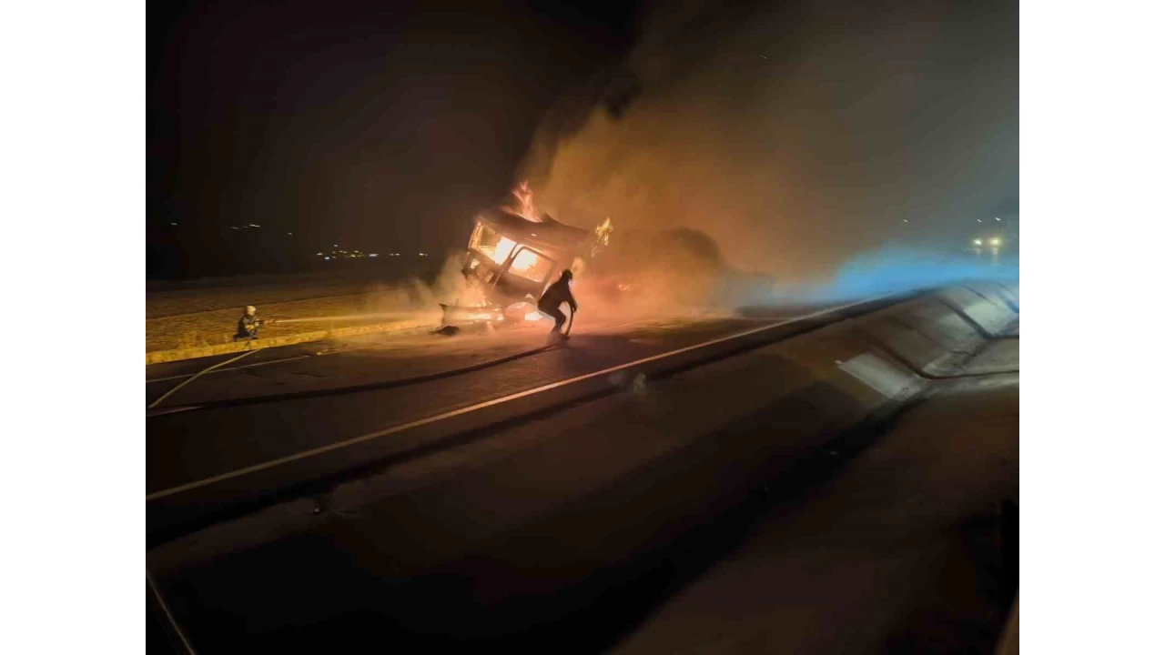 Çarpmanın etkisiyle tırlardan biri alev aldı. İhbar üzerine olay yerine itfaiye ve jandarma ekipleri sevk edildi.