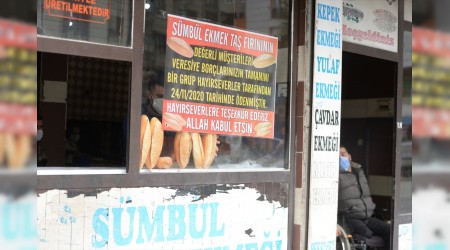 "Sümbül Ekmek Fırınının değerli müşterileri, veresiye borçlarımızın tamamı bir grup hayırsever tarafından 24 Kasım'da ödenmiştir. Hayırseverlere teşekkür ederiz, Allah kabul etsin." yazılı afiş astı.