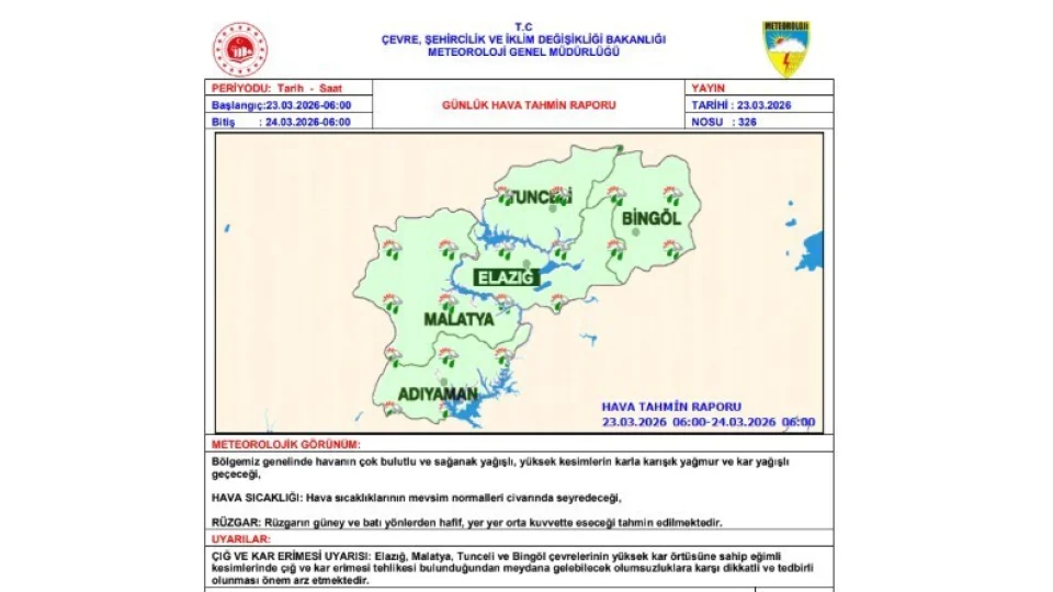 Elazığ, Malatya, Tunceli ve Bingöl çevrelerinin yüksek kar örtüsüne sahip eğimli kesimlerinde çığ ve kar erimesi tehlikesi bulunduğundan meydana gelebilecek olumsuzluklara karşı dikkatli ve tedbirli olunması önem arz etmektedir" ifadelerine yer verildi.