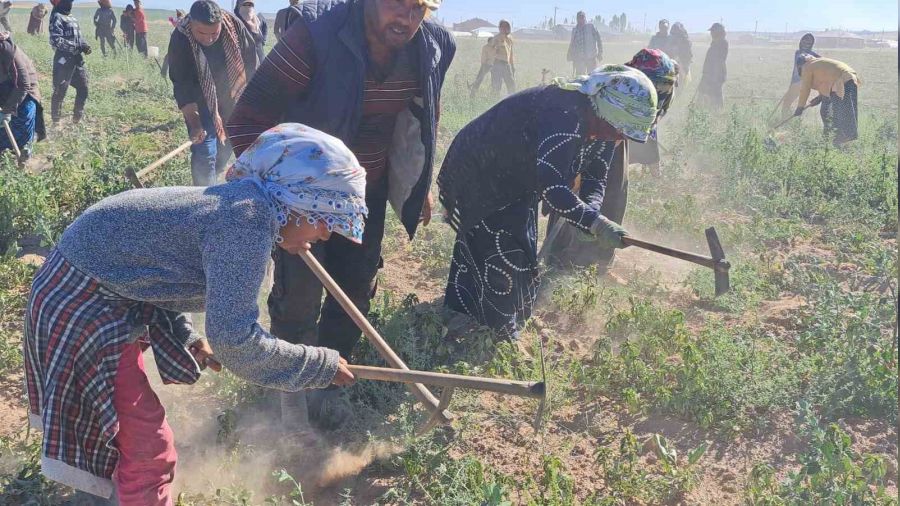 Sabahın erken saatlerinde çapa işine başlayan işçiler, akşam geç saatlere kadar çalışıyor. Genç yaşlı evin bütçesine katkı sağlamak için sıcak altında çalışan işçiler için tarlalar ekmek kapısı oldu.