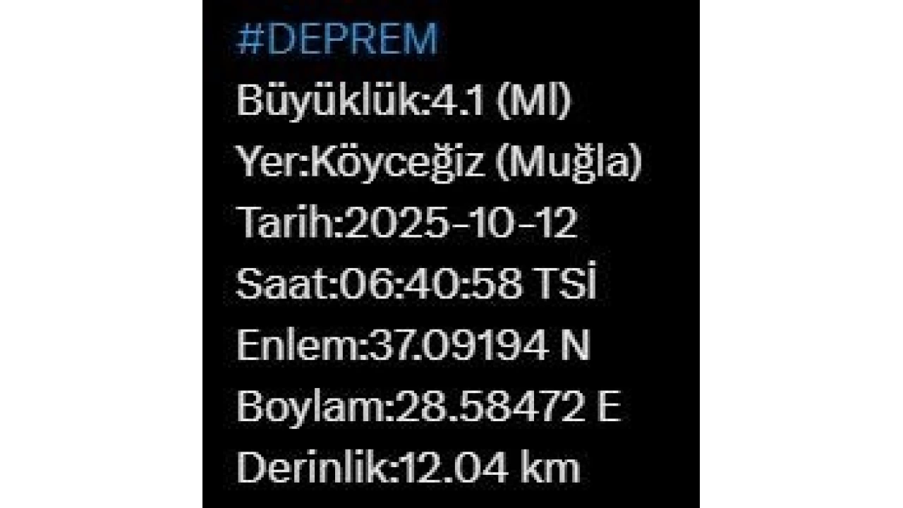 AFAD'ın paylaştığı bilgilere göre, Muğla'nın Köyceğiz ilçesinde saat 02.54'te 4.1 büyüklüğünde deprem meydana geldi. Merkezi Köyceğiz ilçesi olan depremin derinliği 12.01 kilometre olarak ölçüldü.