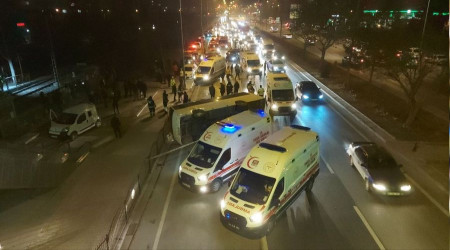 Konya'da seyir halindeki otomobil şerit değiştiren midibüse çarptı. Yan yatan midibüs park halindeki hafif ticari araca çarparken, kazada 2'si ağır 10 kişi yaralandı