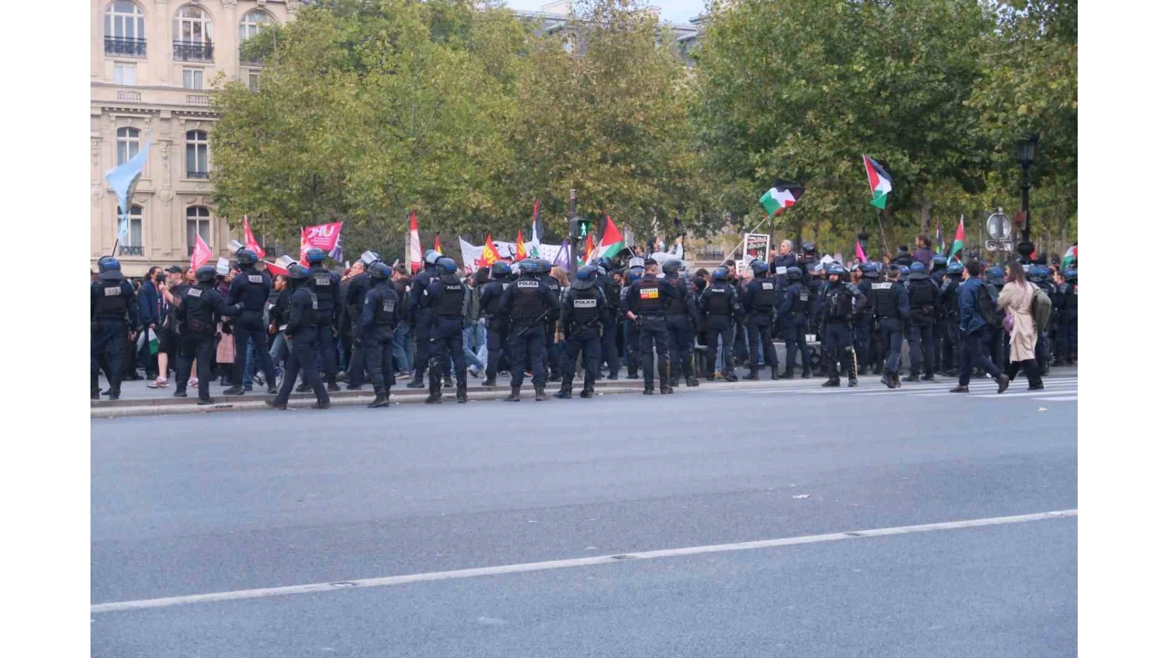 Göstericiler polise karşı sloganlar atarak, güvenlik güçlerinin orantısız güç kullanmasını kınadı. Protestolar sırasında sıklıkla Fransa Deniz Kuvvetleri'ne ait gemilerin Küresel Sumud Filosu'na eşlik etmesi için yola çıkması çağrısında bulunuldu.