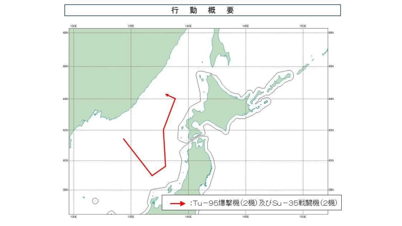 Japonya Savunma Bakanlığı ise Rusya'ya ait 2 Tu-95 stratejik bombardıman uçağı ile 2 Su-35 savaş uçağının ülkenin batı kıyısı açıklarında, Japon Denizi üzerinde uçuş gerçekleştirdiğini duyurdu. Uçakların Japonya'nın Sado Adası'na doğru uçtuktan sonra Kuzey istikametine geri döndüğü belirtilirken, Rus uçaklarının fotoğrafları ile uçuş rotasını gösteren bir harita paylaşıldı.