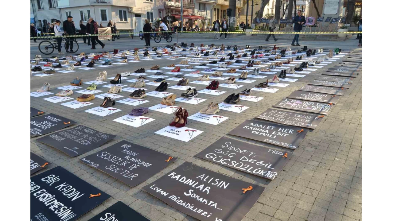 Bursa'nın Mudanya ilçesinde 25 Kasım Kadına Yönelik Şiddete Karşı Uluslararası Mücadele Günü nedeniyle düzenlenen etkinlikte sessiz yürüyüş gerçekleştirilerek, kadın cinayeti kurbanlarını temsilen yere yüzlerce ayakkabı bırakıldı