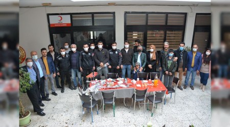 Polis ekipleri, Emniyet Genel Müdürlüğü logolu pastayı keserek kutlama için dernek yönetimine teşekkür etti.