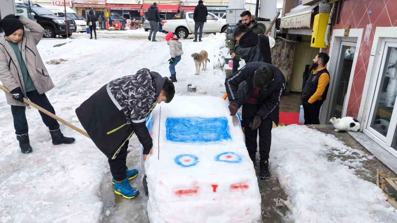 Artvin'in Şavşat ilçesinde ortaokul öğrencileri, kar yağdığında yaşıtları gibi kardan adam yapmak yerine kardan araba yaptılar.
