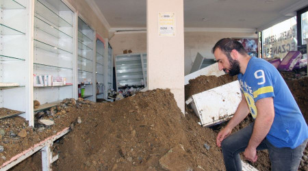 Rize'nin Güneysu ilçesinde meydana gelen sel afeti sonrası ilçe merkezinde çamurla dolan iş yerleri çamurdan temizlenirken, bir eczacının çamurlar içinde ilaçlarını aradığı görüldü.