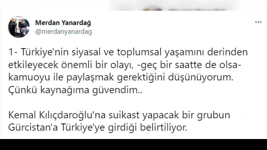 - Türkiye'nin siyasal ve toplumsal yaşamını derinden etkileyecek önemli bir olayı, -geç bir saatte de olsa- kamuoyu ile paylaşmak gerektiğini düşünüyorum. Çünkü kaynağıma güvendim.. Kemal Kılıçdaroğlu'na suikast yapacak bir grubun Gürcistan'dan Türkiye'ye girdiği belirtiliyor.