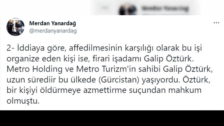 Kılçdaroğlu'na suikast yapacak bir grubun Gürcistan üzerinden Türkiye'ye giriş yaptığı belirtiliyor diyen Merdan Yanardağ, "İddiaya göre, affedilmesinin karşılığı olarak bu işi organize eden kişi ise, firari işadamı Galip Öztürk" ifadelerini kullandı.