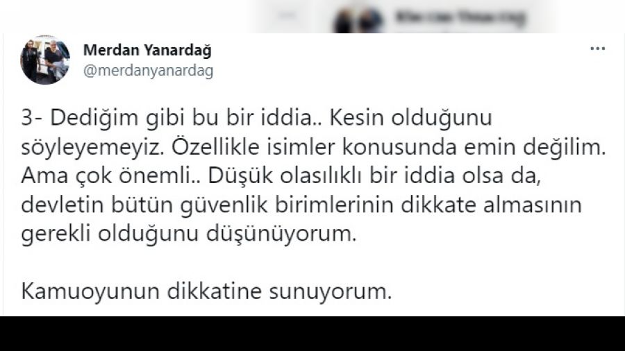 - Dediğim gibi bu bir iddia.. Kesin olduğunu söyleyemeyiz. Özellikle isimler konusunda emin değilim. Ama çok önemli.. Düşük olasılıklı bir iddia olsa da, devletin bütün güvenlik birimlerinin dikkate almasının gerekli olduğunu düşünüyorum. Kamuoyunun dikkatine sunuyorum.