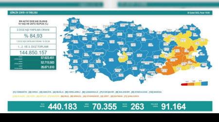 Sağlık Bakanlığı tarafından Türkiye'nin yeni korona virüs tablosu açıklandı. 20 Şubat'ta açıklanan 24 saatlik verilere göre, 70 bin 355 vaka tespit edildi. Virüs nedeniyle hayatını kaybedenlerin sayısı 263 oldu. Bir günde toplam 440 bin 183 test yapılırken, iyileşen hasta sayısı 91 bin 164 olarak kaydedildi. Sağlık Bakanlığı tarafından açıklanan tabloda, 2 doz aşılama verilerine de yer verildi. En az 2 doz aşı olmuş 18 yaş üzeri nüfusu kapsayan verilere göre Türkiye'de 2. doz aşılama ortalama yüzde 84,93 oldu. 1. doz ortalaması yüzde 92,84 olurken, 1., 2. ve 3. doz aşısını olan vatandaş sayısı toplamda 144 milyon 850 bin 157'e yükseldi.