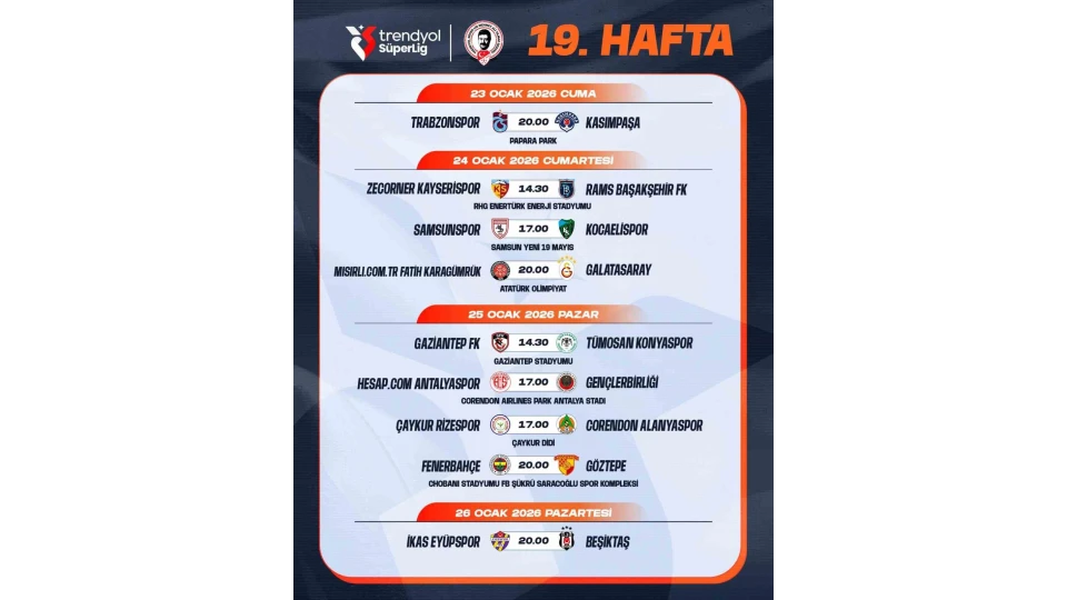 Trendyol Süper Lig'de 18. ve 19. haftalarda oynanacak müsabakaların programı belli oldu. TFF'nin sitesinden yapılan açıklamaya göre, söz konusu haftaların programı şu şekilde: