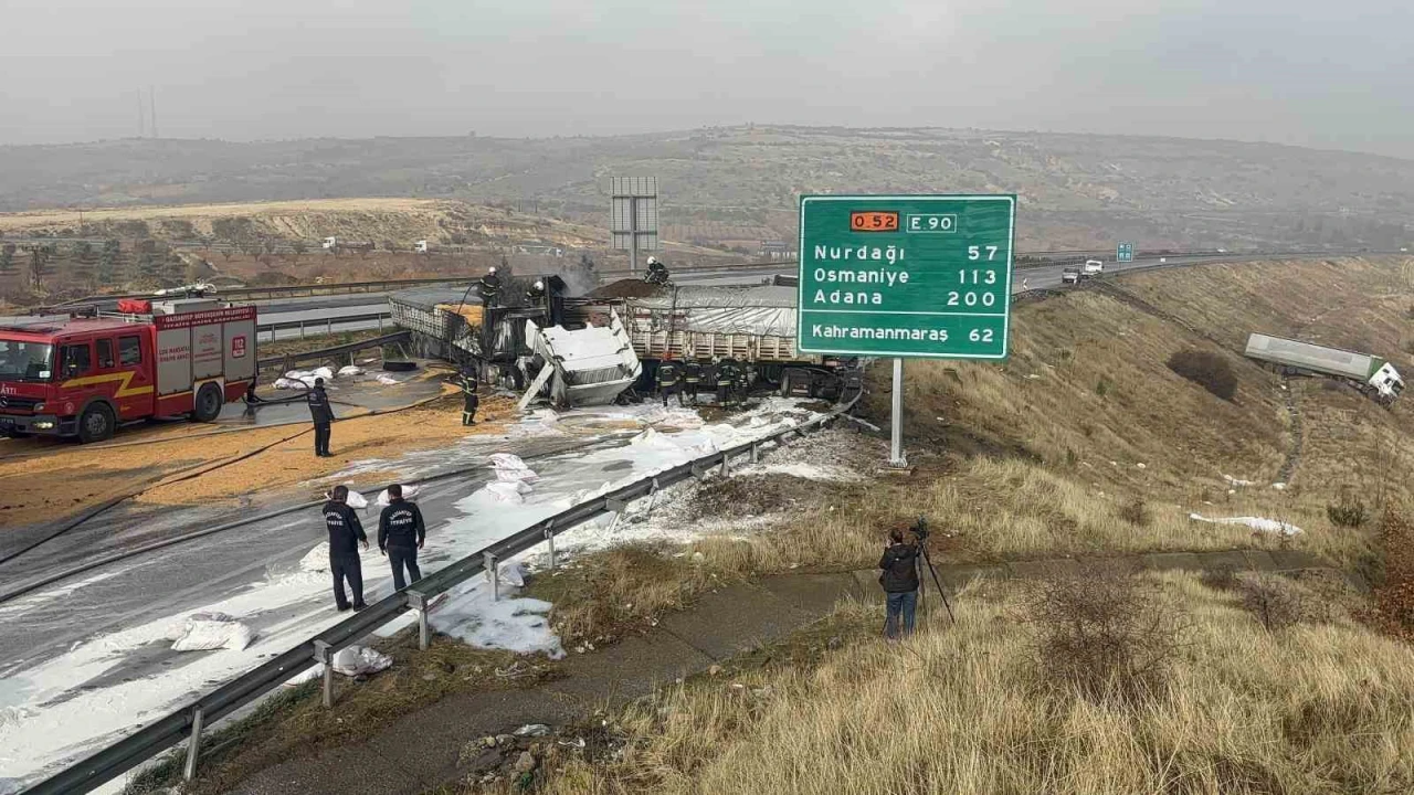 Kaza, Tarsus-Adana-Gaziantep (TAG) Otoyolu Gaziantep batı gişeleri kesiminde meydana geldi. İddiaya göre, plakaları ve sürücülere öğrenemeyen mısır, un vs gübre yüklü 3 tırın karıştığı kaza sonrası yangın çıktı.