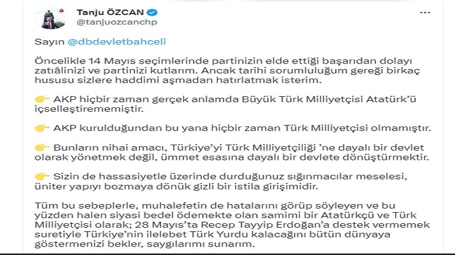 "Sayın Devlet Bahçeli Öncelikle 14 Mayıs seçimlerinde partinizin elde ettiği başarıdan dolayı zatıâlinizi ve partinizi kutlarım. Ancak tarihi sorumluluğum gereği birkaç hususu sizlere haddimi aşmadan hatırlatmak isterim.