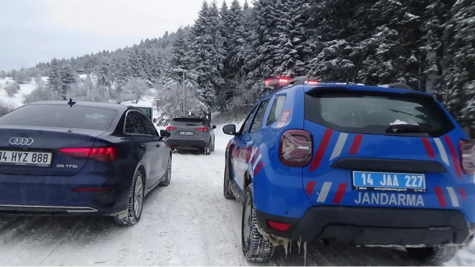 Bolu'nun turizm merkezi Abant Gölü Milli Parkı, yoğun kar yağışı sonrası beyaza büründü. Hafta sonu tatili için parka akın eden ancak kış lastiği bulunmayan sürücüler yolda kalınca, yardımlarına jandarma ekipleri koştu.