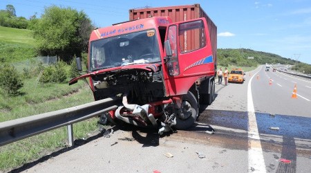 Bolu'da TEM Otoyolu'nda seyir halindeyken kontrolden çıkarak bariyere ok gibi saplanan kamyonun sürücüsü yaralandı.