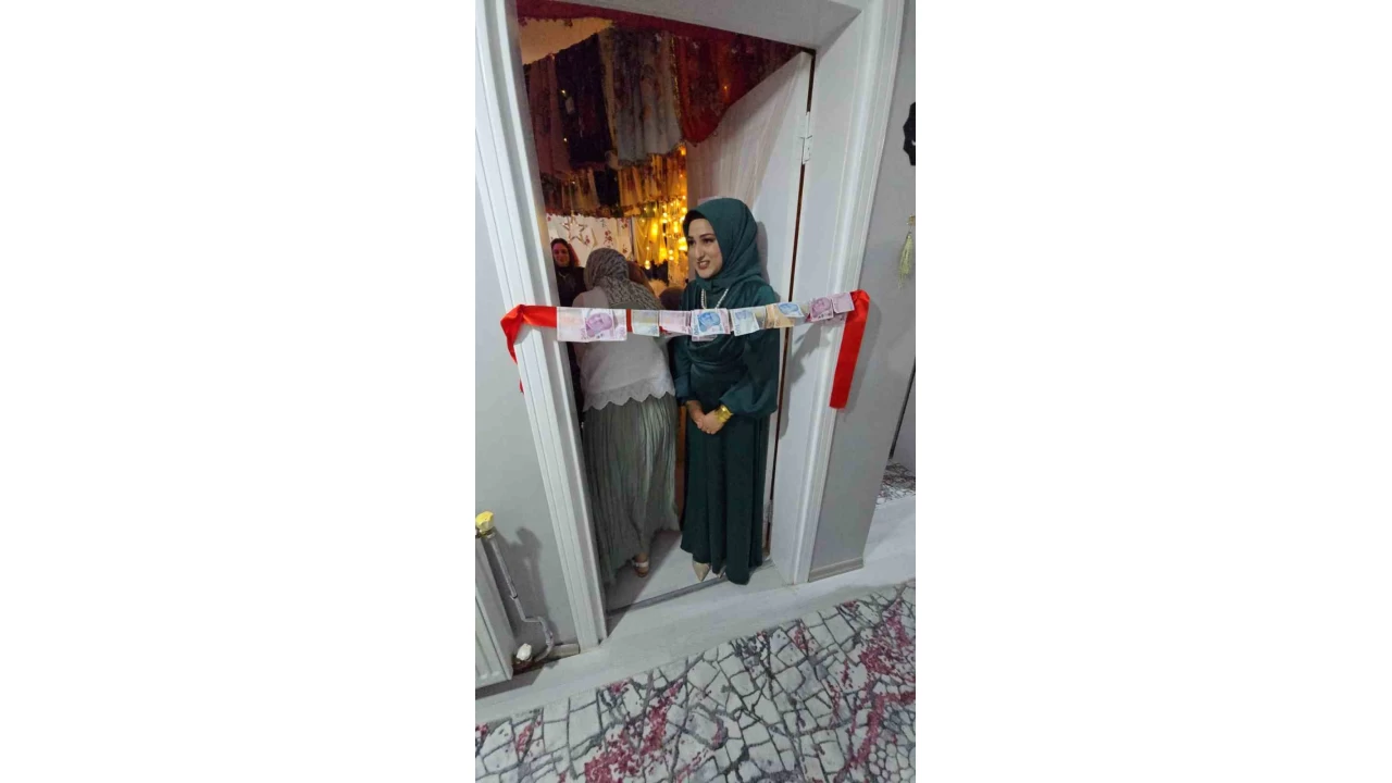 Damat tarafı ise köydeki geleneklere uygun şekilde, çeyiz odasının kapısına gelin tarafından asılan kurdeleye para takarak odaya girdi.