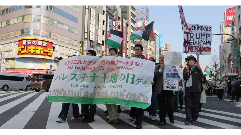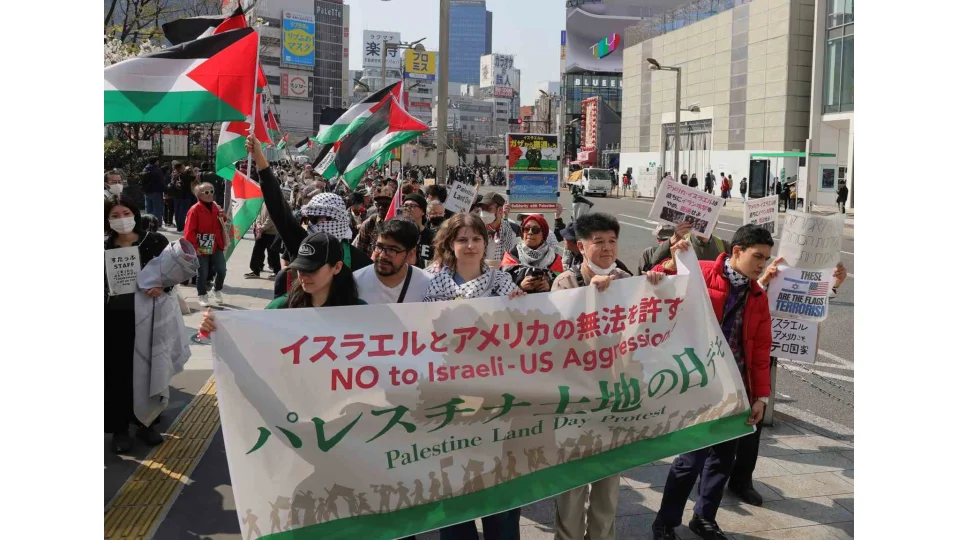 Filistin direnişinin simgelerinden olan 30 Mart Toprak Günü yaklaşırken, Japonya'nın başkenti Tokyo'da Gazze'ye destek için "İsrail ve ABD saldırganlığına hayır" yürüyüşü gerçekleştirildi.
