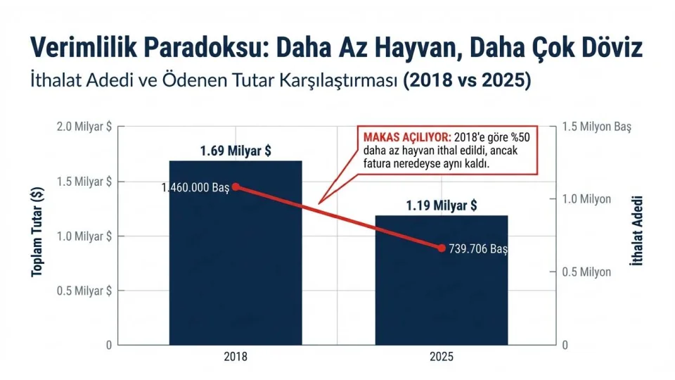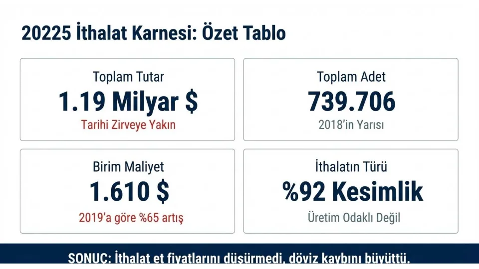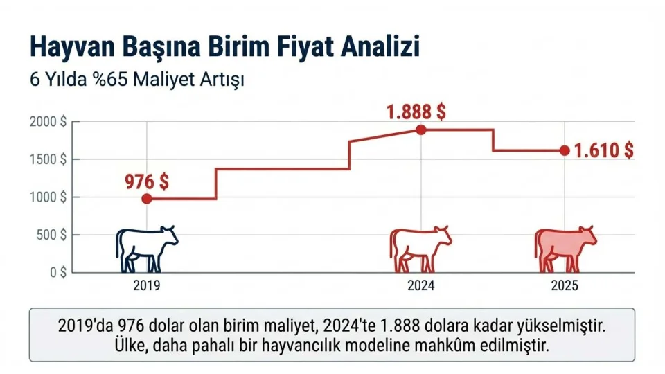 Birim maliyet artışının rakamlarla anlatan Ömer Fethi Gürer, "2019 yılında bir hayvanın ithalat maliyeti yaklaşık 976 dolar iken, bu rakam 2024'te 1.888 dolara kadar çıktı, 2025'te ise 1.610 dolar seviyelerinde gerçekleşti. Sadece altı yıl içinde hayvan başına maliyet yüzde 65'in üzerinde arttı. İthalat, iddia edildiği gibi et fiyatlarını düşürmedi; aksine ülkeyi daha pahalı bir hayvancılık modeline mahkûm etti" dedi.