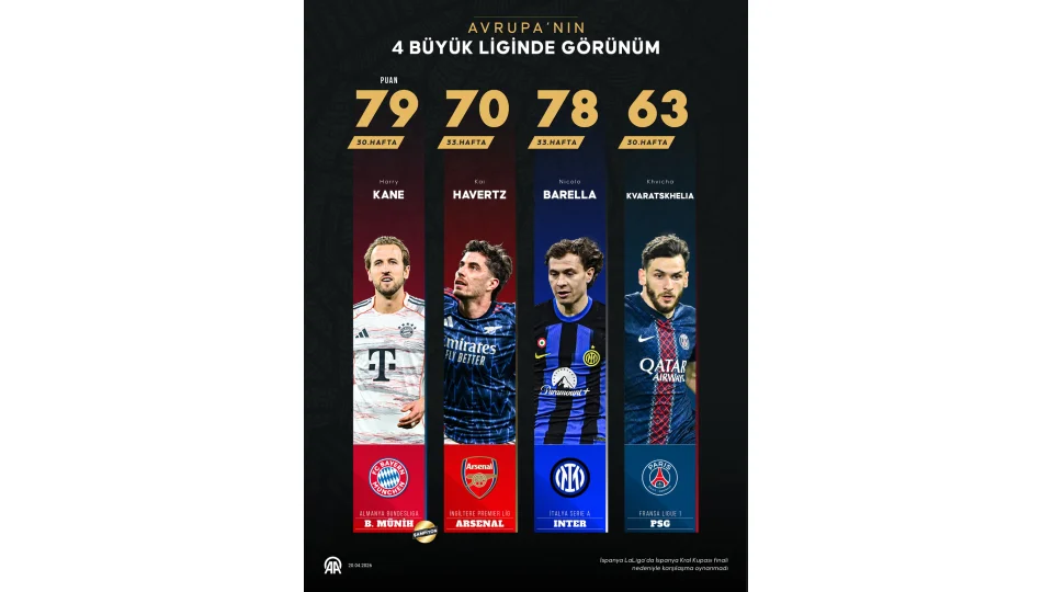 İngiltere'de (Premier Lig) Arsenal, İtalya'da (Serie A) Inter ve Fransa'da (Ligue 1) Paris Saint-Germain (PSG), puan tablosunun zirvesinde yer aldı.
