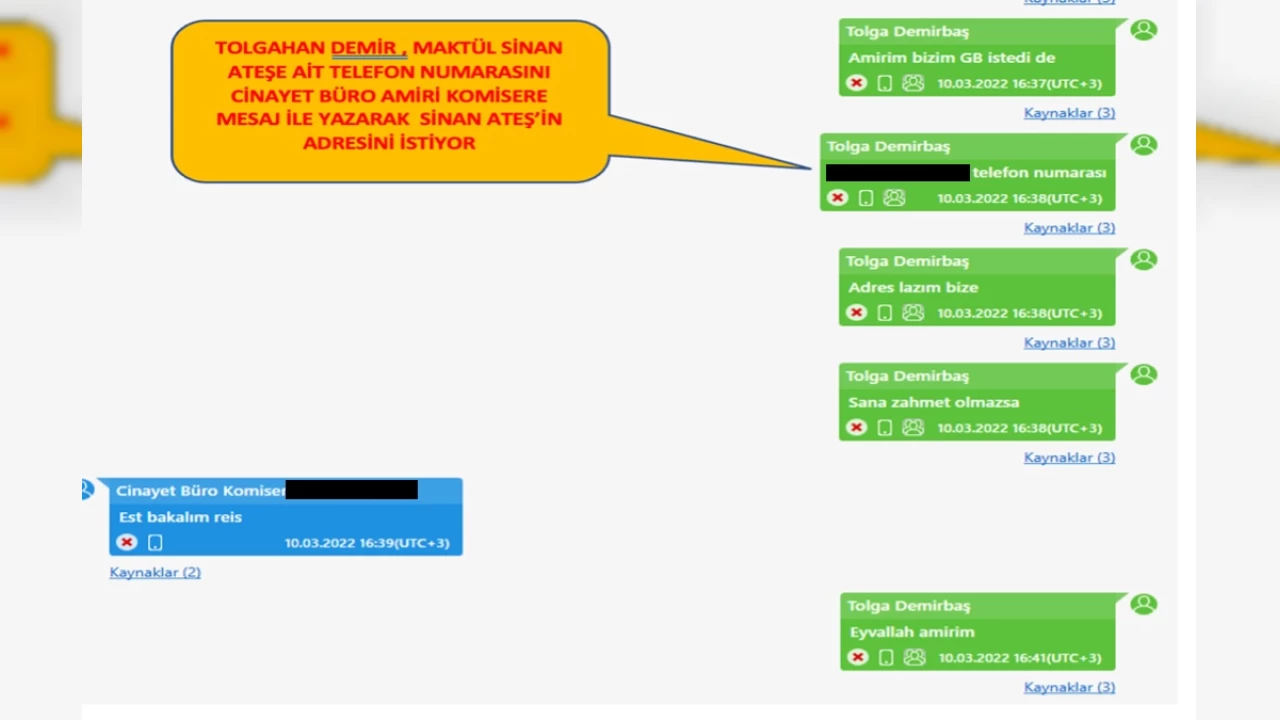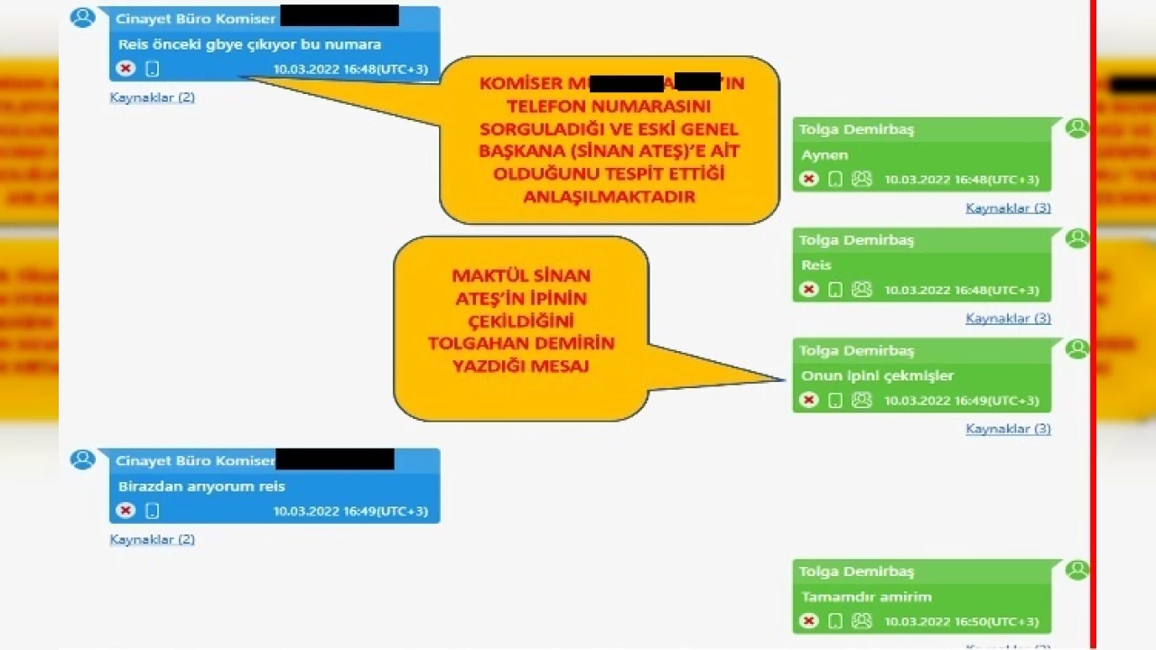 Bilirkişi raporunda, Demirbaş'ın yazışmaları yer aldı. Yazışmalar, Ateş'in öldürülmesinden yaklaşık 9 ay öncesinden başlanarak takibe alındığını gösteriyor. Buna göre Demirbaş, soruşturmanın emniyet ayağında aktif görev yaptığı ortaya çıkan ve 19 Ekim'de gözaltına alınarak tutuklanan Cinayet Büro Komiseri M.E.A.'ya 10 Mart 2022'de, Ateş'in öldürülmesinden 9 ay önce, "Amirim bizim GB (Genel Başkan) istedi de, 0505 …. telefon numarası, adres lazım bize sana zahmet olmazsa" diyerek Ateş'in telefon numarasını gönderiyor. Komiser M.E.A ise "Reis" diye hitap ettiği Demirbaş'a, "Reis önceki GB'ye çıkıyor bu numara" yanıtını veriyor. Demirbaş'ın cevabı ise, "Aynen reis, onun ipini çekmişler" oluyor. Sonrasında ise M.E.A, "Birazdan arıyorum reis" yanıtını veriyor.