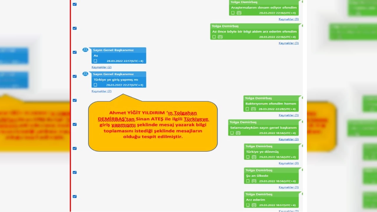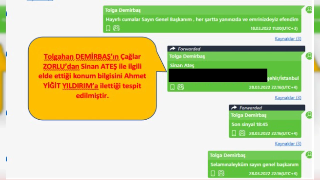 Demirbaş'ın yazışmalarında en dikkat çekici boyutlardan biri de, Ülkü Ocakları Başkanı Ahmet Yiğit Yıldırım ile gerçekleşen konuşmalar. Eski MİT mensubu olduğu iddia edilen Çağlar Zorlu'dan gelen bilgileri Tolgahan Demirbaş, Yıldırım'a "Araştırmalarım devam ediyor efendim, az önce böyle bilgi aldım, arz ederim" diyerek iletiyor. Bir başka yazışmada Yıldırım, Demirbaş'a, Sinan Ateş'in Türkiye'ye giriş yapıp yapmadığını soruyor. "Hemen baktırıyorum" diyen Demirbaş, bir gün sonra "Türkiye'ye dönmüş şu an ülkede" yanıtını veriyor.