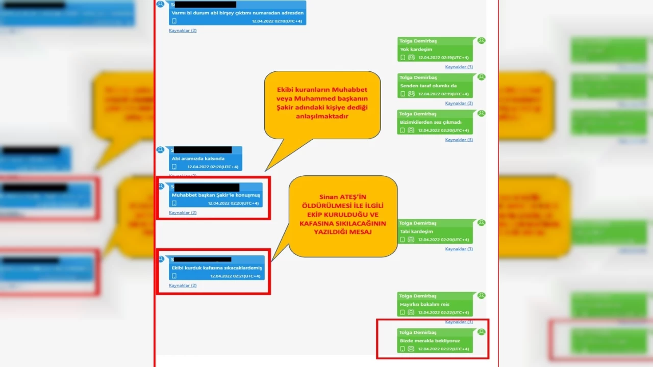 Tolgahan Demirbaş ve Emre Yüksel arasındaki en dikkat çekici yazışma ise Sinan Ateş'in vurulmasından yaklaşık 40 dakika önce gerçekleşiyor. Demirbaş, saat 12.54 ve 12.58'de Yüksel'e bir konum gönderiyor. Saat 14.48'de ise Ateş'in saldırıya uğrayarak hayatını kaybettiğine dair başka bir grupta yazılan paylaşımı Yüksel'e iletiyor. Demirbaş'ın Yüksel'e gönderdiği konum, cinayetin aydınlatılması açısından çok önemli bir delile dönüşüyor.