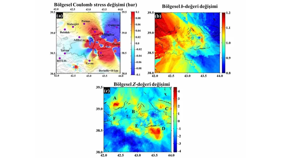 Birçok farklı bilimsel veriyi birlikte analiz ettiklerini ifade eden Alkan, "Van Gölü ve civarına baktığımızda gölün çevresinde birçok fay ve fay zonu bulunmaktadır. Özellikle gölün doğusuna baktığımızda kuzeyde Çaldıran, güneyde Hasan Timur, Başkale ve Saray fay zonları bizim için oldukça önemlidir. Bu zonlar aynı zamanda doğuya doğru İran içerisine giren Hoy ve Salmas gibi fay zonlarıyla da etkileşim halindedir. Yaptığımız çalışmalardan elde ettiğimiz sonuçlara göre, tek bir parametreden değil de birden çok parametreyi hesaplayıp o parametreler üzerinden bir değerlendirme yapmaya çalışıyoruz ki doğru olan yöntem de budur. Birden çok parametreyi hesapladığımızda, gölün doğusu göreceli olarak batısına göre daha yüksek stresli görünmektedir. Biz bunları Coulomb stres parametresi, B değeri değişimi, sismik durgunluk, RIPI skor algoritması, depremlerin derinlikleri, odak mekanizması çözümleri ve depremlerin yıllara göre dağılımı gibi birçok parametreden faydalanarak belirliyoruz" dedi.