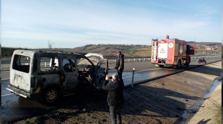 Tekirdağ'ın Malkara ilçesinde seyir halindeki hafif ticari araçta yangın çıktı. Araçta bulunan 2 kişi atlayarak kurtulurken, yanan araç hurda yığınına döndü
