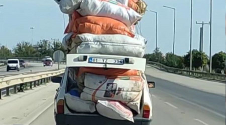 Tarsus-Adana-Gaziantep (TAG) otoyolu Mersin istikametinde üzerinde aşırı yük olan otomobili görenler hayrete düştü. Hem bagajda, hem de otomobilin tavan kısmında torbalarla eşya taşıyan sürücü bu görüntüsüyle kamyonetlere adeta kafa tuttu.