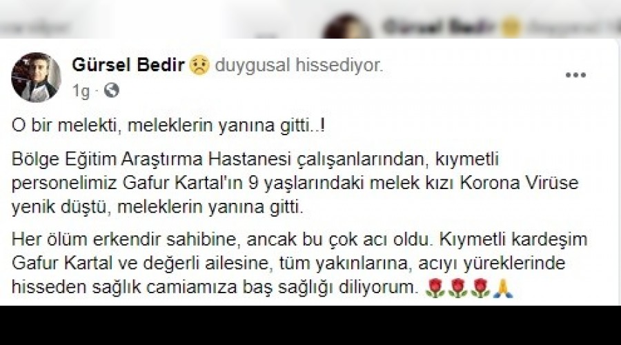 Öte yandan, Erzurum İl Sağlık Müdürü Gürsel Bedir, sosyal medya hesabından 'O bir melekti, meleklerin yanına gitti. Bölge Eğitim Araştırma Hastanesi çalışanlarından, kıymetli personelimiz Gafur Kartal'ın 9 yaşlarındaki melek kızı, korona virüse yenik düştü, meleklerin yanına gitti. Her ölüm erkendir sahibine, ancak bu çok acı oldu. Kıymetli kardeşim Gafur Kartal ve değerli ailesine, tüm yakınlarına, acıyı yüreklerinde hisseden sağlık camiamıza başsağlığı diliyorum' paylaşımında bulundu. İHA
