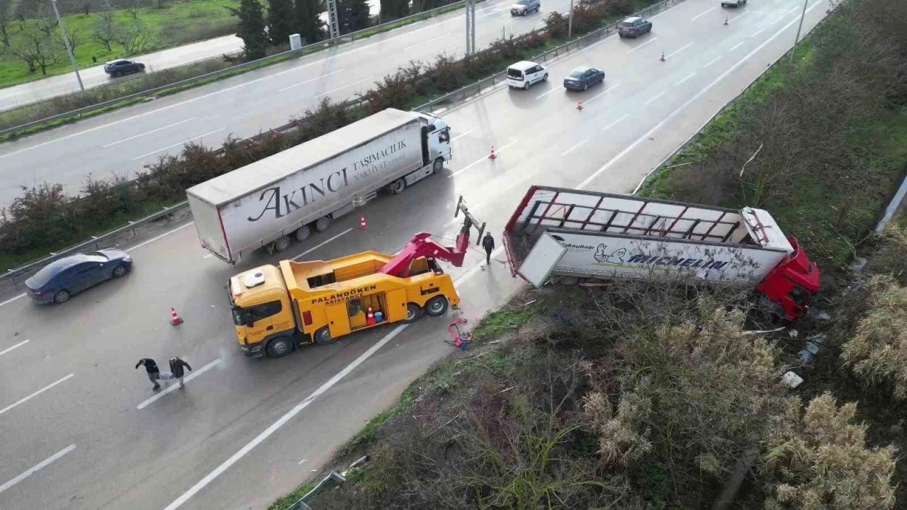 Bursa'da kontrolden çıkan tır refüje uçtu. Facianın teğet geçtiği kazada sürücü yaralanırken, otobanda trafik uzun kuyruklar oluşturdu