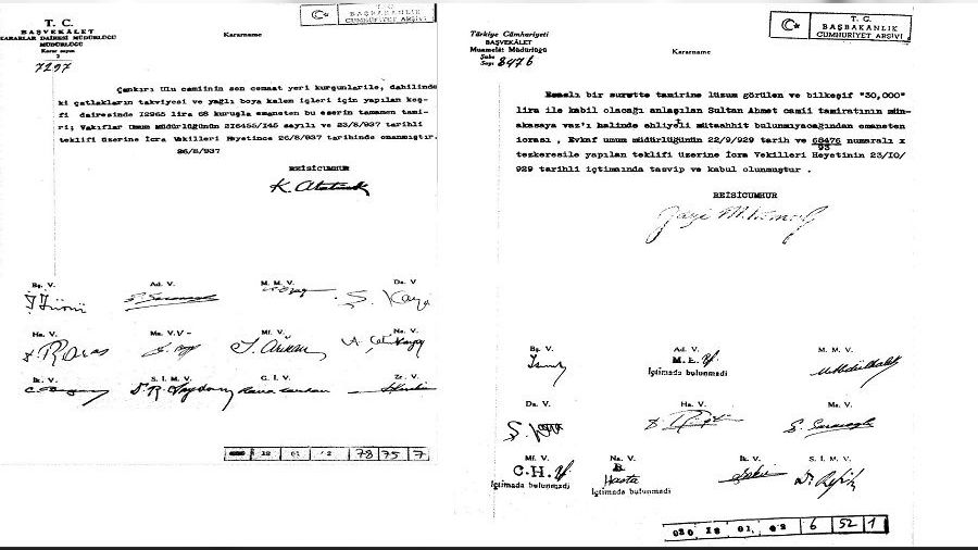 "1999 lira ve 70 kuruş bedeli keşfi bulunan İstanbul Eyüp Camii kurşun ve sıva tamiratının teahhüde talip çıkmadığından emaneten yaptırılması, Evkaf Umum Müdürlüğü'nün 6/12/1931 tarih ve 160 numaralı tezkeresiyle vukû bulan teklifi üzerine İcra Vekilleri Heyeti'nin 9/12/1931 tarihli içtimaında tasvip ve kabul olunmuştur. İmza: Gazi Mustafa Kemal."
